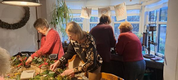 Onder begeleiding van Jacqueline en Wilma hebben we weer een prachtig duurzaam kerststuk gemaakt. Er was veel materiaal zowel groen alsook allerlei versieringen, door Wilma weer bij de Kringloopwinkels verzameld! Er werd gewerkt met afbreekbare oases. Verder hebben we kaarsen gegoten van koolzaad vetbolletjes. Erg leuk om te doen! Het werd een gezellige middag waarop we onze creatieve geest ruim baan konden geven. Op boomschors, waarin eerst geboord en gebeiteld moest worden, om de potjes met kaars rechtop te kunnen plaatsen. Hierdoor verschenen mooie, gevarieerde werkstukken.